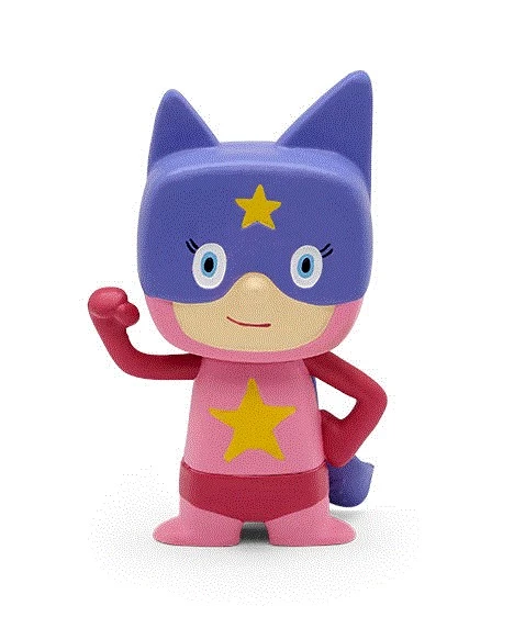 Der Kreativ-Tonie Superheld Mädchen trägt eine lila Maske und ein Cape. Auf ihrem pinken Anzug prangt ein großer gelber Stern.